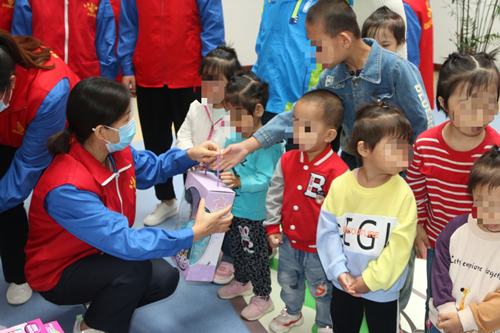 志愿者們?yōu)楹⒆觽円灰凰蜕蠄D畫書、水彩筆、小零食、玩具等禮物,孩子們有的緊緊抱著芭比娃娃,有的跑著追逐跳躍的皮球,有的吃著松脆的餅干露出甜甜的笑容......