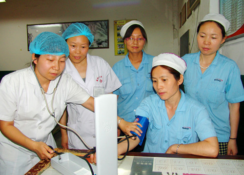 為保障職工的身體健康,確保全體職工全身心投入到安全生產(chǎn)工作中,日前,集團(tuán)公司下屬企業(yè)陜棉八廠連日來組織機(jī)關(guān)干部、醫(yī)護(hù)人員為生產(chǎn)一線職工送清涼,每天把綠豆湯、冷飲等消暑品送到職工崗位上,公司醫(yī)護(hù)人員定期在車間巡查,把防暑降溫藥品、健康知識手冊等送到職工手中,并給職工們講一些日常防暑降溫措施,真正把企業(yè)對職工的關(guān)懷送到職工心上。(圖為公司醫(yī)護(hù)人員在生產(chǎn)一線為職工測量血壓、發(fā)放健康手冊)